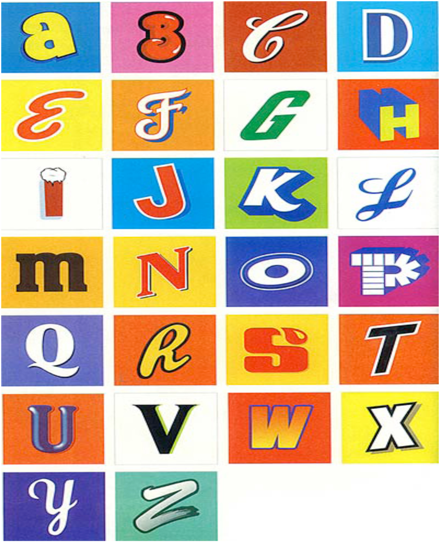 A: ALL, B: BUBBLICIOUS, C: CAMPBELLS, D: DAWN, E: EGGO, F: FRITOS, G: GATORADE, H: HEBREW NATIONAL, I: ICE, J: JELLO (SUGAR FREE), K: KOOLAID, L: LYSOL, M: M & M’S, N: NILLA WAFERS, O: OREO, P: PEZ, Q: Q-TIPS, R: REESE’S, S: STARBURST, T: TIDE, U: UNCLE BEN’S, V: V8, W: WISK, X: XTRA LAUNDRY DETERGENT, Y: YORK PEPPERMINT PATTIES, Z: ZEST